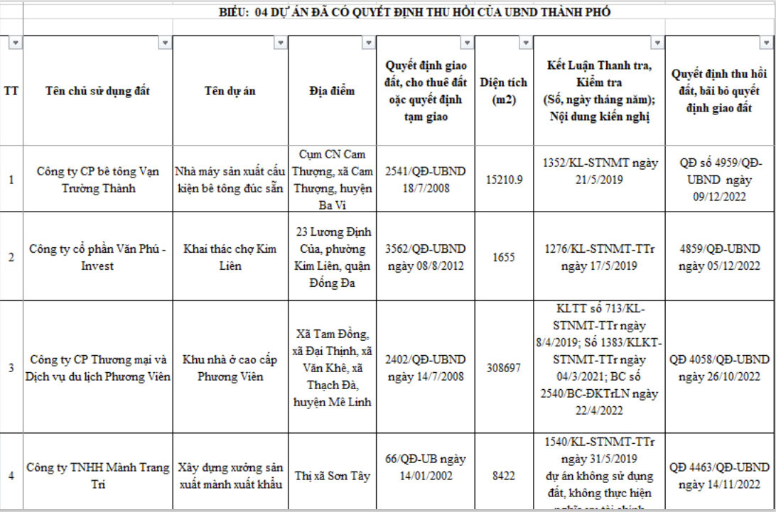 Dưới đây là chi tiết 27dự án vốn ngoài ngân sách chậm tiến độ triển khai, một số dự án vi phạm pháp luật trên địa bàn đã có quyết định thu hồi của UBND TP: