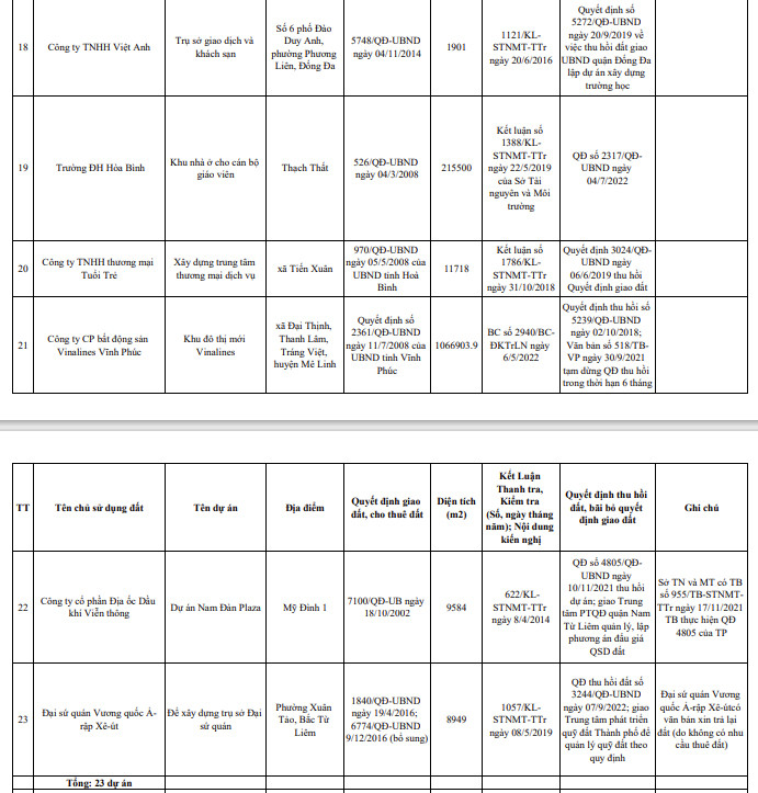 Thực hiện Kế hoạch số 160/KH-UBND ngày 08/6/2022 của UBND TP về việc thực hiện Nghị quyết số 04/NQ-HĐND ngày 08/4/2022 của HĐND TP,... trên cơ sở kết quả xử lý đối với các dự án vốn ngoài ngân sách có sử dụng đất chậm triển khai trên địa bàn, Sở Tài nguyên và Môi trường đề nghị UBND các quận, huyện, thị xã chỉ đạo các phòng, ban, đơn vị có liên quan và UBND xã, phường, thị trấn tổ chức công khai, minh bạch thông tin xử lý đối với 27 dự án UBND TP đã có quyết định thu hồi đất; bãi bỏ quyết định giao đất, cho thuê đất, chuyển mục đích sử dụng đất; chấm dứt hoạt động dự án.