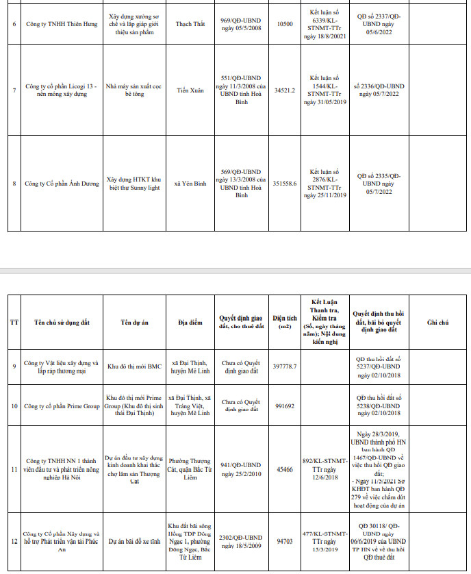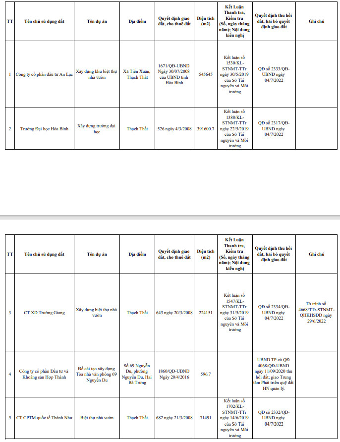 Theo đó, tại huyện Thạch Thất có Dự án Xây dựng khu biệt thự nhà vườn (xã Tiến Xuân) do Công ty CP An Lạc làm chủ đầu tư với quy mô gần 55ha; Dự án xây dựng biệt thự nhà vườn của Công ty Xây dựng Trường Giang quy mô 22,4ha; Dự án biệt thự nhà vườn (huyện Thạch Thất) của Công ty CP Thương mại quốc tế Như Thành.