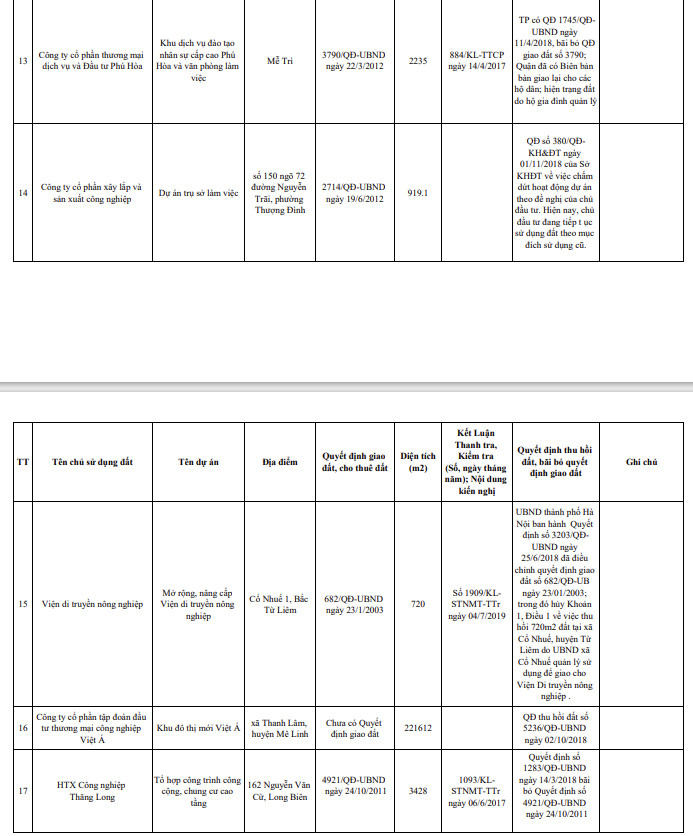Ngoài ra, còn có Dự án Nam Đàn Plaza, phường Mỹ Đình 1 (quận Nam Từ Liêm) của Công ty CP Địa ốc Dầu khí Viễn thông; Dự án Tổ hợp công trình công cộng, chung cư cao tầng, số 162 Nguyễn Văn Cừ (quận Long Biên), chủ đầu tư là Hợp tác xã Công nghiệp Thăng Long;...