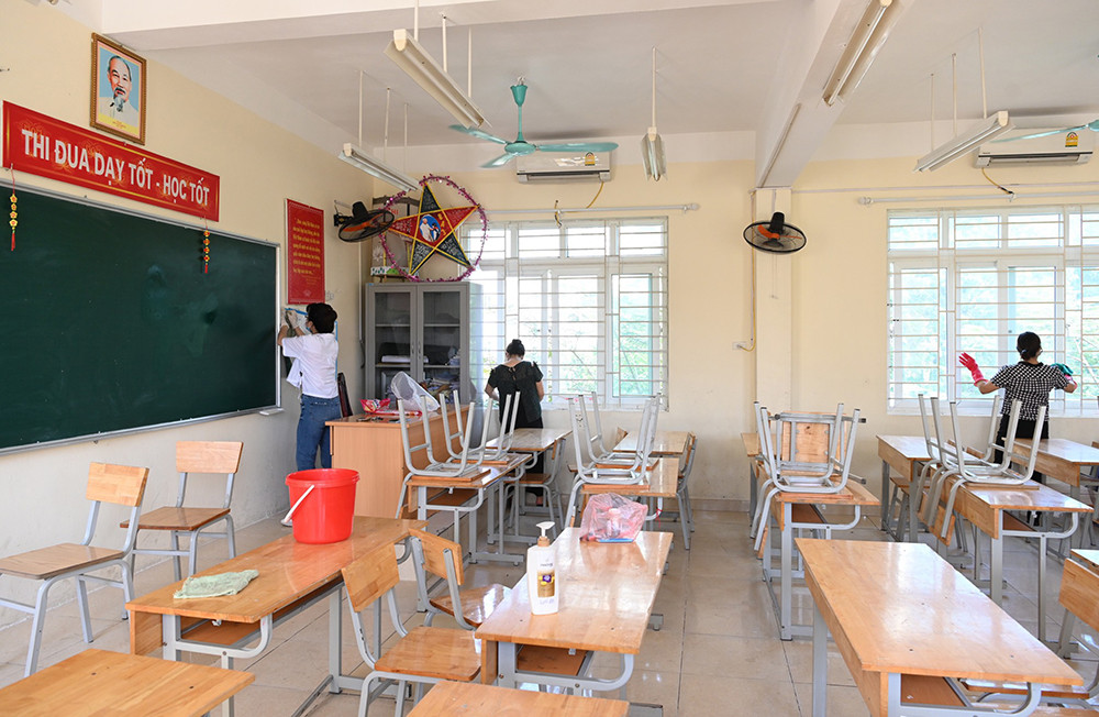 Các trường tại Hà Nội đã phun khử khuẩn, lau dọn bàn ghế, phòng học, chuẩn bị khẩu trang, nước sát khuẩn tay, thực hiện quy định giãn cách, không quá 20 học sinh/phòng học mà Bộ Giáo dục và Đào tạo đề ra.