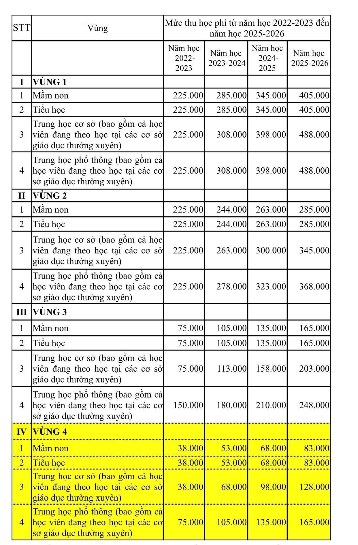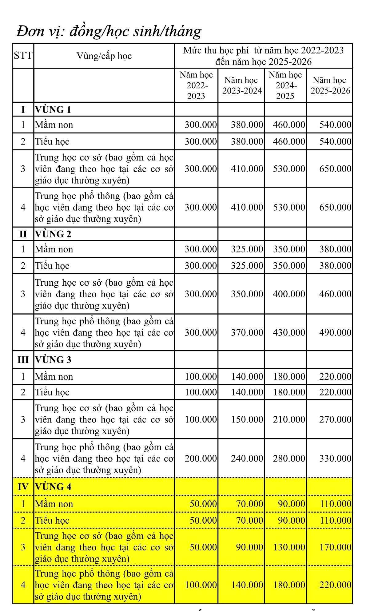 Năm học 2022-2023: Mức thu học phí đối với bậc mầm non, giáo dục phổ thông công lập chưa tự bảo đảm chi ở vùng 1 và vùng 2 là 300.000 đồng, với vùng 3 là 100.000-200.000 đồng, vùng 4 là 50.000-100.000 đồng/tháng. Trong các năm tiếp theo, mức thu học phí sẽ tăng dần. Đến năm 2025-2026, mức thu học phí ở vùng 1 tăng lên từ 240- 350.000 đồng so với năm 2022-2023. Cụ thể bậc tiểu học vùng 1 năm học tới quy định mức học phí đối với học sinh tiểu học là 300.000 đồng, thì năm 2025-2026 là 540.000 đồng; Học sinh phổ thông năm học tới học phí 300.000 đồng thì 3 năm sau mức học phí là 650.000 đồng.