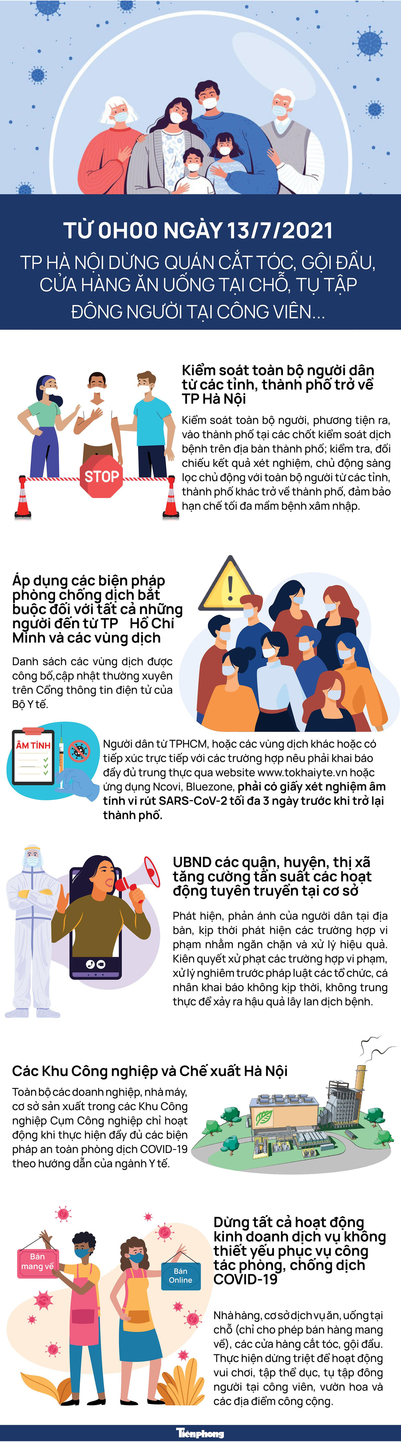 TPO - Thành phố Hà Nội quyết định từ 00h00 ngày 13/7/2021: Dừng tất cả hoạt động kinh doanh dịch vụ không thiết yếu phục vụ công tác phòng, chống dịch COVID-19: Nhà hàng, cơ sở dịch vụ ăn, uống tại chỗ (chỉ cho phép bán hàng mang về), các cửa hàng cắt tóc, gội đầu. Thực hiện dừng triệt để hoạt động vui chơi, tập thể dục, tụ tập đông người tại công viên, vườn hoa và các địa điểm công cộng.