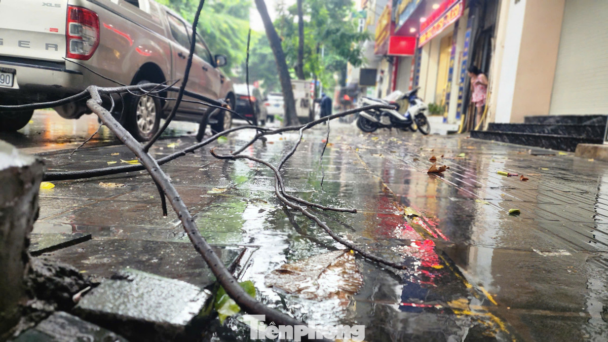Trên phố Trần Nhân Tông, một số cây đổ từ hôm qua vẫn chưa được dọn dẹp, gây cản trở giao thông và ảnh hưởng đến việc đi lại của người dân.