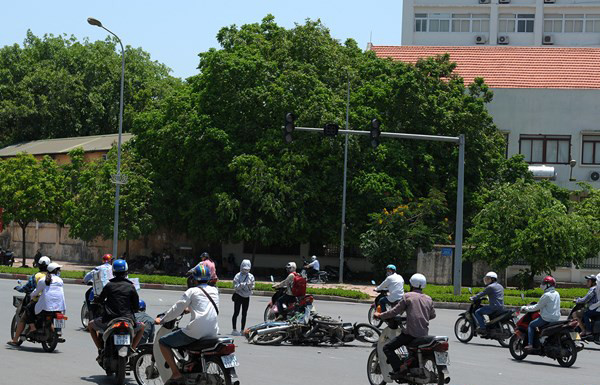 Nhiều xe máy đi đường chưa đến ngã tư nhưng cũng dừng đột ngột dưới một tán cây để chờ đèn đỏ, việc này sẽ gây nguy hiểm cho chính họ và những người đi phía sau nếu không làm chủ được tốc độ.