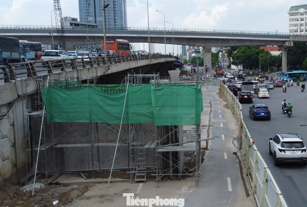 | Phần bờ dẫn phía Nam (từ đường Phạm Hùng chạy lại) giữa trung tâm nút giao vẫn chỉ là những hố được khoan sâu để chuẩn bị đổ thêm các trụ. |