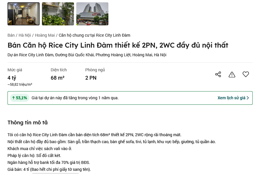 Tương tự, dự án NƠXH Rice City – Tây Nam Linh Đàm (phường Hoàng Liệt, quận Hoàng Mai), thời điểm mở bán năm 2015 có giá gần 15 triệu đồng/m2. Đến hiện tại, sau 9 năm các căn hộ NƠXH tại đây đang được rao bán với giá 54 – 59 triệu đồng/m2.