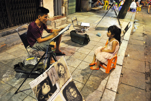 Dịch vụ vẽ chân dung trên vỉa hè phố Hàng Buồm - thứ không thể có khi nơi đây chưa thành phố đi bộ.