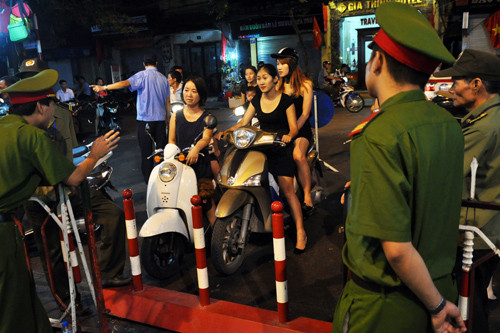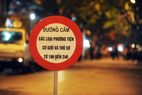 Công an, dân phòng cùng rào chắn được bố trí tại đầu tuyến phố để hướng dẫn người dân chấp hành quy định, ngăn xe máy, ôtô. Tại điểm đầu phố Mã Mây, lực lượng công an, dân phòng liên tục nhắc nhở người tham gia giao thông.
