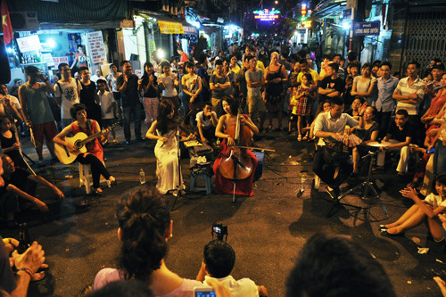 Giữa ngã tư Tạ Hiện - Lương Ngọc Quyến cũng có một nhóm đàn dây biểu diễn phục vụ người dân và khách du lịch miễn phí.