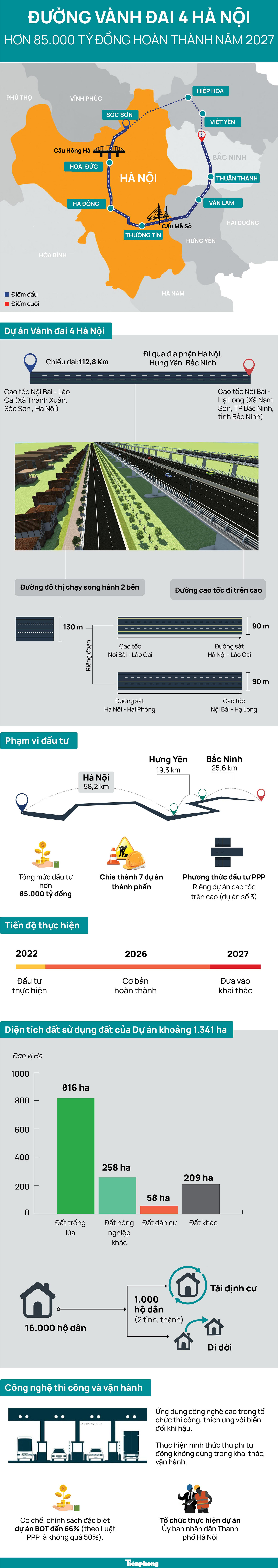 Để xây dựng tuyến đường Vành đai 4 với thiết kế, mặt bằng được giải phóng như trên, đại diện đơn vị Tư vấn dự án cho biết, đường Vành đai 4- Vùng thủ đô có 1.341 ha đất nằm trong diện phải GPMB. Trong đó riêng trên địa phận thành phố Hà Nội là 741 ha. Phân tích các loại đất phải GPMB, đơn vị Tư vấn cho biết, đất trồng lúa chiếm diện tích lớn nhất với khoảng 816 ha, tiếp đến là đất nông nghiệp khác khoảng 258 ha. Ít nhất là đất dân cư khoảng 58 ha. Số hộ dân phải thực hiện phương án di dời, tái định cư tại 2 tỉnh Hưng Yên, Bắc Ninh và thành phố Hà Nội khi thực hiện dự án Vành đai 4- Vùng thủ đô vào khoảng trên 1.000 hộ.