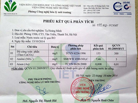 Để làm rõ mức độ nhiễm bẩn của nước sinh hoạt nhà mình, anh Tạ Hồng Minh (sống tại tầng 15, CT5, KĐT Xa La) đã mang mẫu nước lấy từ máy lọc nước đến Viện Công nghệ Môi trường (Viện Hàn lâm Khoa học và Công nghệ Việt Nam - số 18 Hoàng Quốc Việt, Hà Nội) để phân tích 3 chỉ số là độ cứng toàn phần (theo CaCO3), amoni (NH4+) và arsen theo quy chuẩn quốc gia về chất lượng nước ăn uống. Kết quả là nồng độ amoni là 7,46 mg/l (hàm lượng tối đa cho phép là 3 mg/l); hàm lượng arsen tuy chưa vượt chuẩn 0,01mg/l nhưng cũng ở mức lo ngại 0,008mg/l.