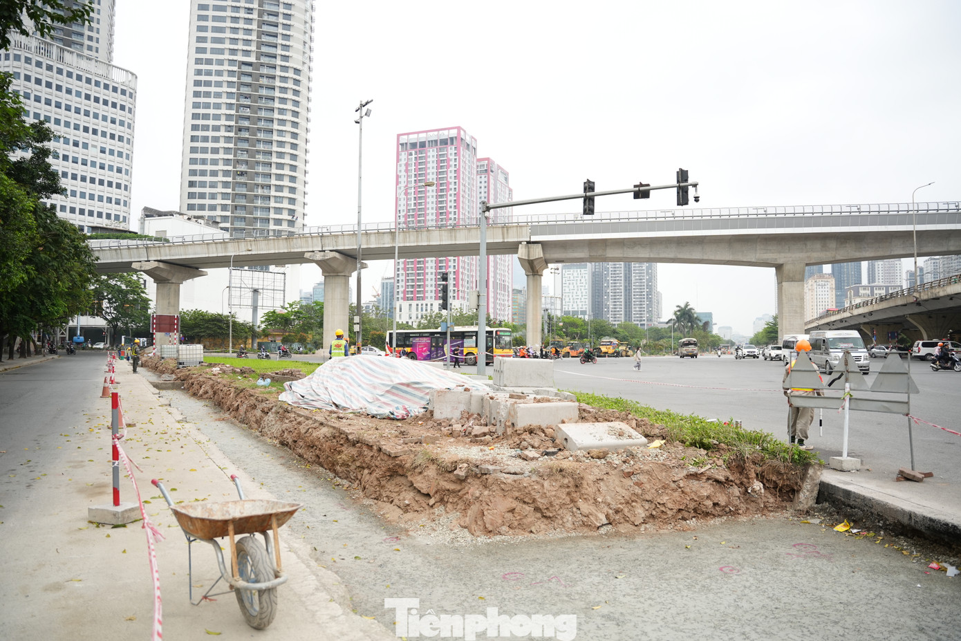 Hướng từ đường Xuân Thuỷ rẽ phải vào Phạm Văn Đồng (trước cửa Đại học Quốc gia Hà Nội), đơn vị thi công đã căng dây khoanh vùng khu vực dựng rào chắn và tiến hành thi công các hạng mục đầu tiên.