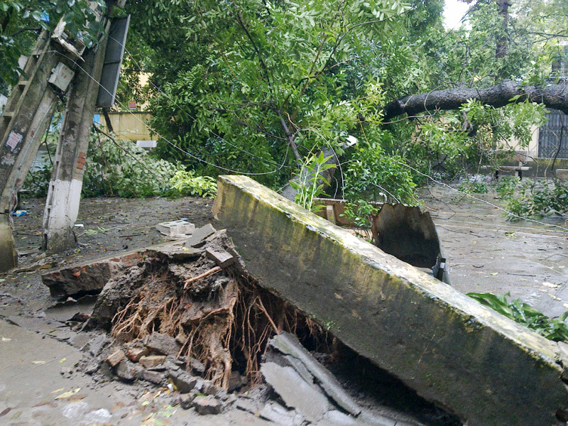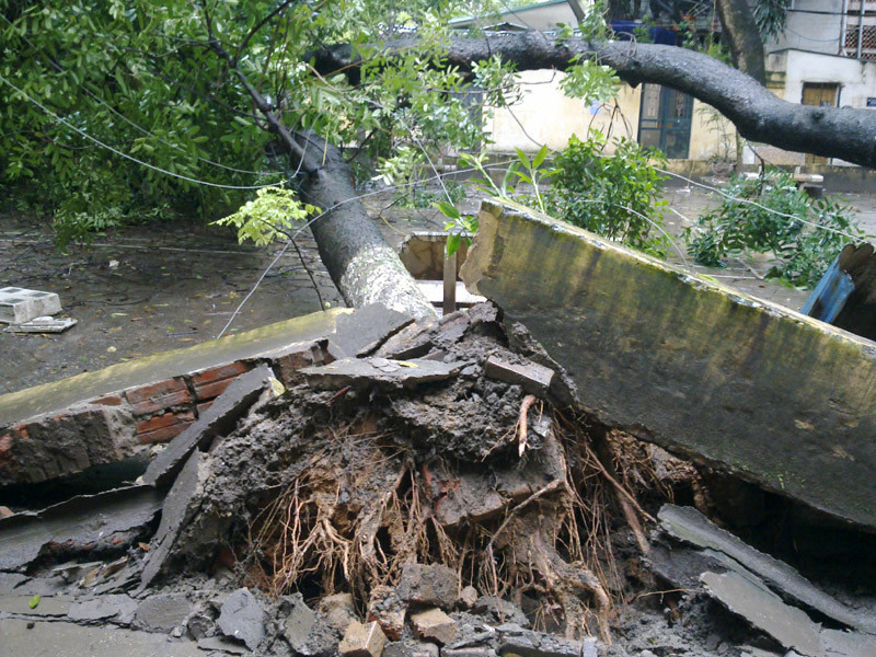 Thời điểm cây đổ vào lúc các hộ dân xung quanh khu tập thể này đang nghỉ trưa. Nghe tiếng cành cây sàn sạt, tiếng gãy rắc, mọi người vội chạy ra xem thì thấy hai cây xà cừ đã đổ ầm xuống giữa sân, kéo gãy cả cột điện bên cạnh. Do mưa to, gió lớn, dây điện bị đứt nổ lốp bốp khiến nhiều người hoảng sợ, vội vã ngắt cầu dao điện trong nhà.
