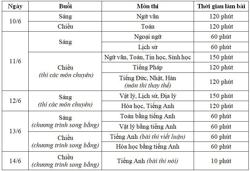 Ngày 11/6: buổi sáng thi Ngoại ngữ, Lịch sử. Buổi chiều cùng ngày, thí sinh sẽ dự thi các môn chuyên gồm: Ngữ văn, Toán, Tin học, tiếng Pháp, tiếng Đức, tiếng Nhật, tiếng Hàn (và các tiếng thi thay thế tương ứng với môn chuyên thí sinh đăng ký).