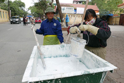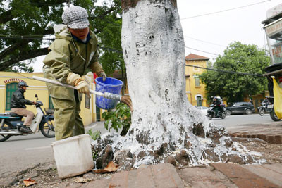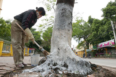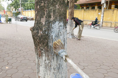 Các công nhân công ty cây xanh Hà Nội đang quét vôi lên gốc cây trên phố Thụy Khuê, Hà Nội.