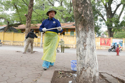 1 thùng xe vôi cùng những dụng cụ đơn giản, các công nhân công ty cây xanh Hà Nội thầm lặng với công việc hàng ngày của mình.