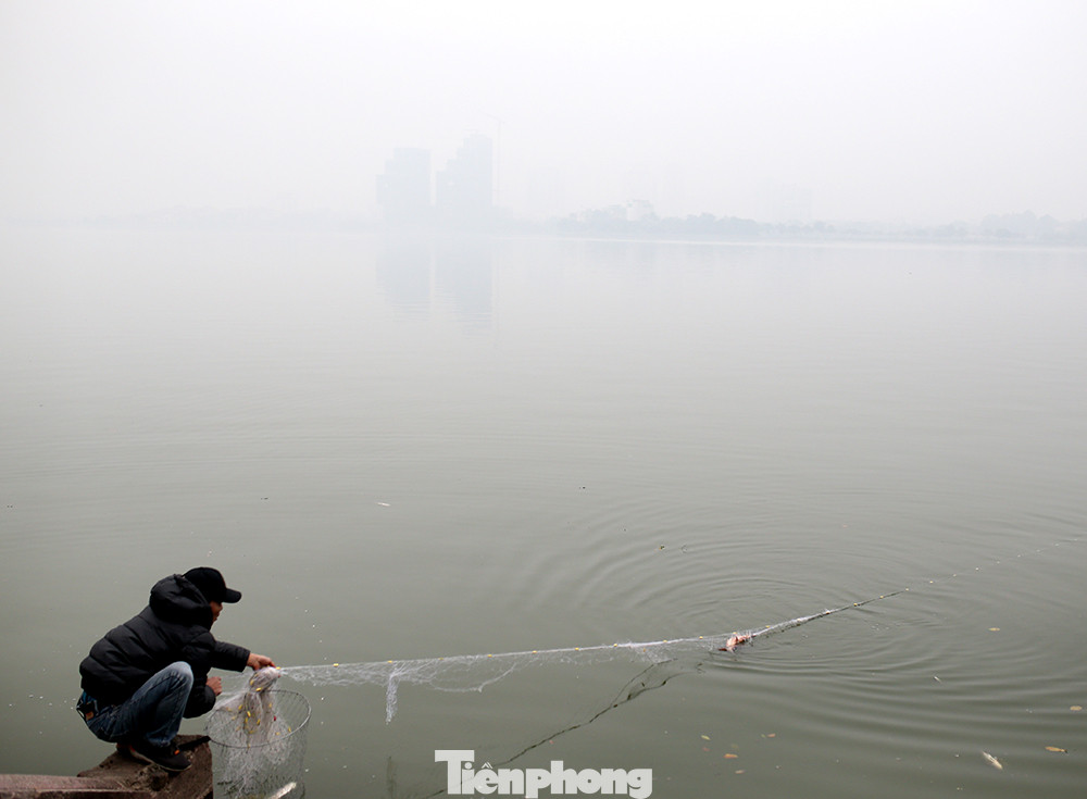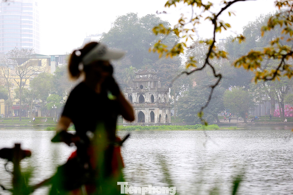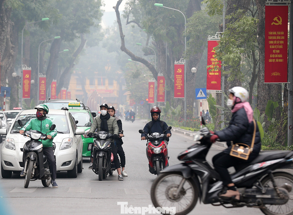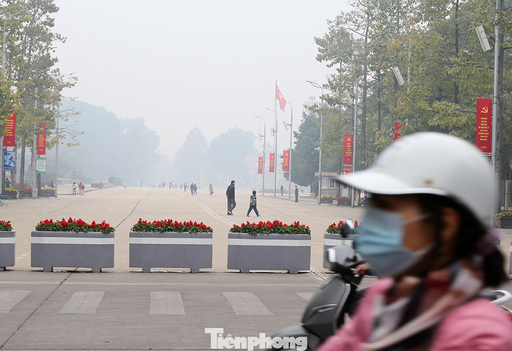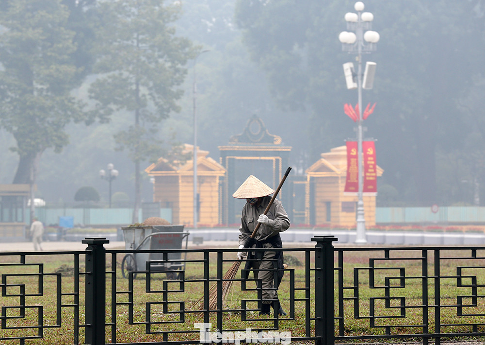Người lao động quét dọn trước quảng trường Ba Đình với trời u ám mù sương vào sáng nay