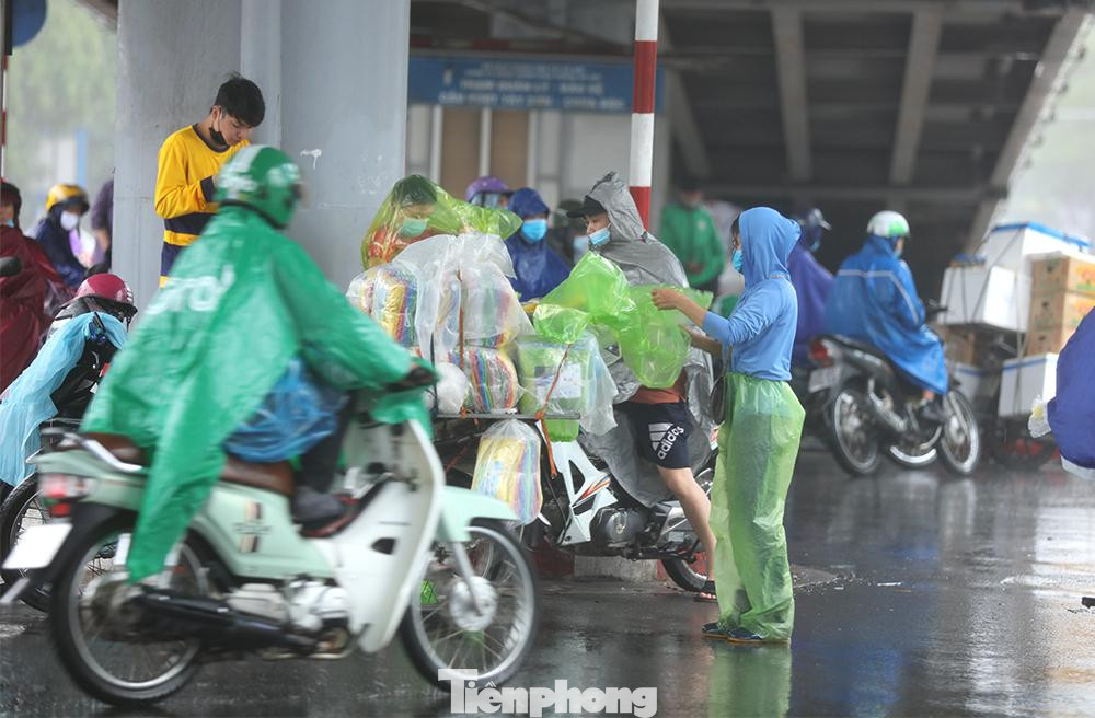 | Cơn mưa ập đến bất ngờ, khiến một người lái xe công nghệ không kịp mặc áo mưa trên đường Nguyễn Trãi |