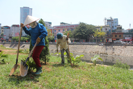 Bà Đào Thị Chiến (46 tuổi, ở Phúc Thọ - Hà Nội) cho biết: "Bọn tôi làm việc từ 7h sáng đến hơn 11h trưa thì nghỉ, nắng nóng vẫn phải làm. Mấy hôm nay quá nắng, chỉ mong sao mưa xuống cho mát. Tôi trồng cây xanh, cỏ ven bờ sông Tô Lịch; nắng như này mệt lắm nhưng phải cố làm thôi chứ biết sao được".