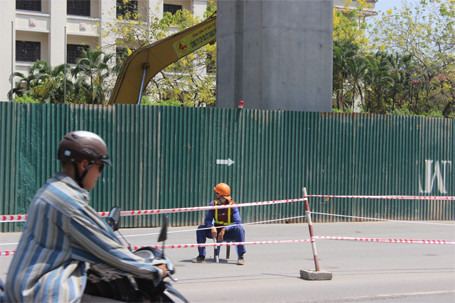 Người công nhân của công trường tuyến đường sắt Cát Linh - Hà Đông ngồi hàng tiếng đồng hồ dưới nắng nóng để cảnh báo giao thông cho người đi đường.