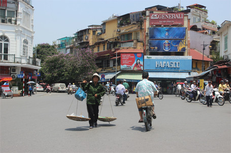 Người phụ nữ rong ruổi với gánh hàng rong.