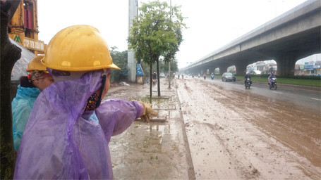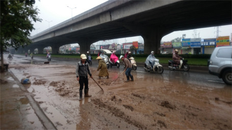 “Thực trạng trên diễn ra khoảng 4 đến 5 ngày hôm nay rồi. Nguyên nhân là do các xe của công trường trong này họ đi, do trời mưa đất cát dính vào bánh nó vương vãi khắp ra đường như này. Xe cộ đi lại qua đây rất nguy hiểm, nếu không chủ động tránh rất dễ xảy ra tai nạn. Chúng tôi kêu nhiều quá, họ mới cho vài người ra hỗ trợ như dọn cùng chúng tôi. Anh em chúng tôi rất vất vả, tình trạng này cứ tái diễn, chúng tôi không có sức đâu mà dọn. Rất mong cơ quan chức năng vào cuộc xử lý, để chúng tôi đỡ vất vả” – anh Nguyễn Văn Hùng (38 tuổi), công nhân thuộc Xí nghiệp môi trường Thành Công (Thanh Xuân - Hà Nội) cho biết.