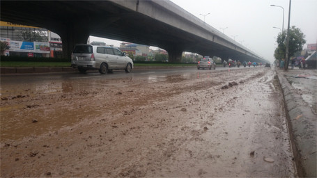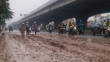 Theo quan sát của phóng viên vào lúc 8h30 sáng nay (10/3), đoạn đường kể trên vẫn “ngập tràn” bùn đất. Mặt khác, do thời tiết mưa phùn nên đất cát đã nhão ra và quyện vào nhau, khiến mặt đường rất trơn. Các phương tiện lưu thông qua đây một mặt phải “chống chọi” với thời tiết mưa phùn làm cản trở tầm nhìn, mặt khác còn phải “liều mình” đi sang làn ô tô để tránh nguy cơ “vồ ếch” ở làn đường bên trong.