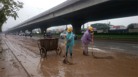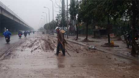 Một số công nhân môi trường cho biết thêm, thực trạng này diễn ra suốt cả ngày và theo họ quan sát thì xe của công trường gần đó khi đi ra đường đã không rửa bánh xe, nên khối lượng đất cát mới cứ vương vãi ra đường như vậy.