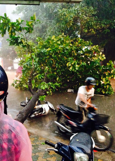 Cây đổ đã đè lên nhiều xe máy. Anh Xuân Linh ở Hoàng Mai cho biết, khi đi đến đường Nguyễn Xiển, gió lốc mạnh, anh trú vào viả hè thì bất ngờ cây xoài cỡ lớn ven đường đổ, rất may anh chạy kịp.