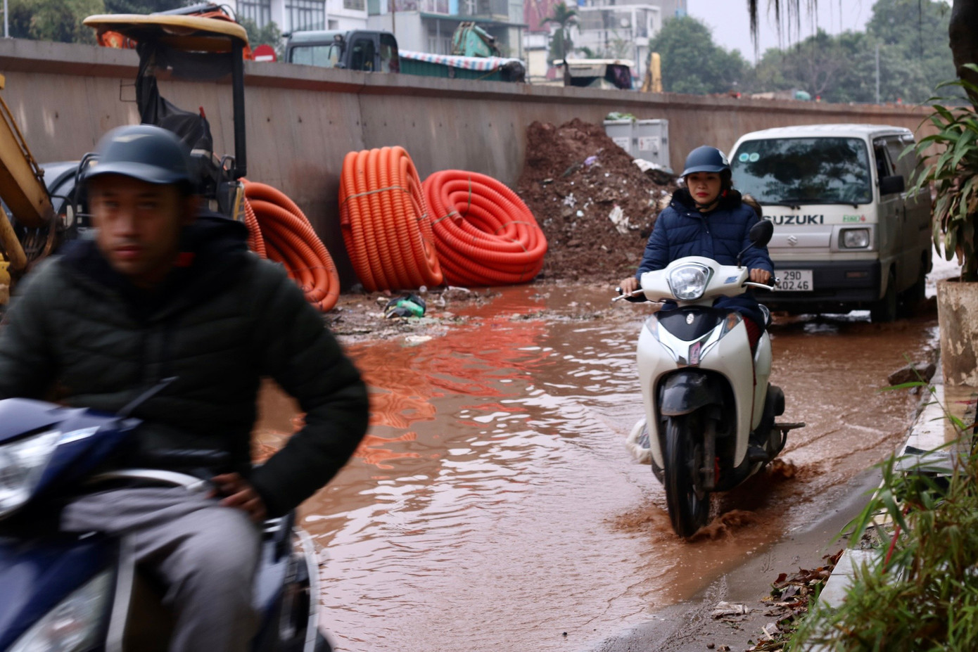 | Những ngày mưa người dân chật vật di chuyển trên những đoạn đường gom bên cạnh dự án. |