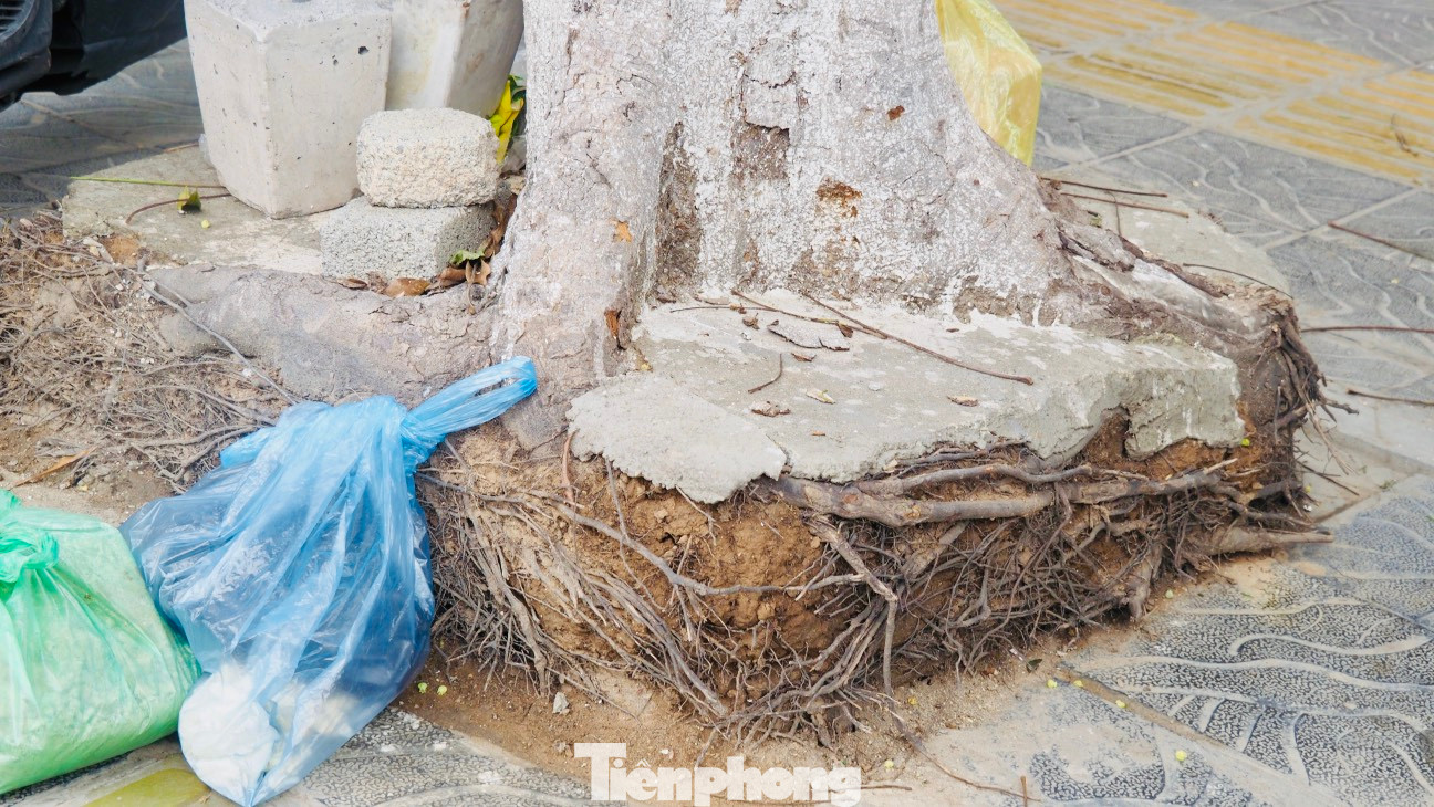 Dọc vỉa hè hai bên tuyến phố hàng loạt cây xanh có bộ rễ trồi lên khỏi mặt đất. Một số gốc cây không thể bám vào đất, dần đổ nghiêng xuống lòng đường. Điều này gây bất an cho người dân sinh sống tại đây.