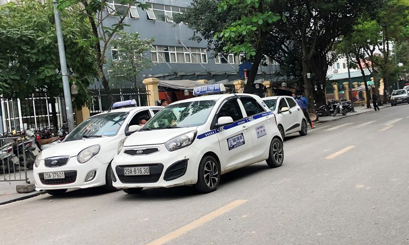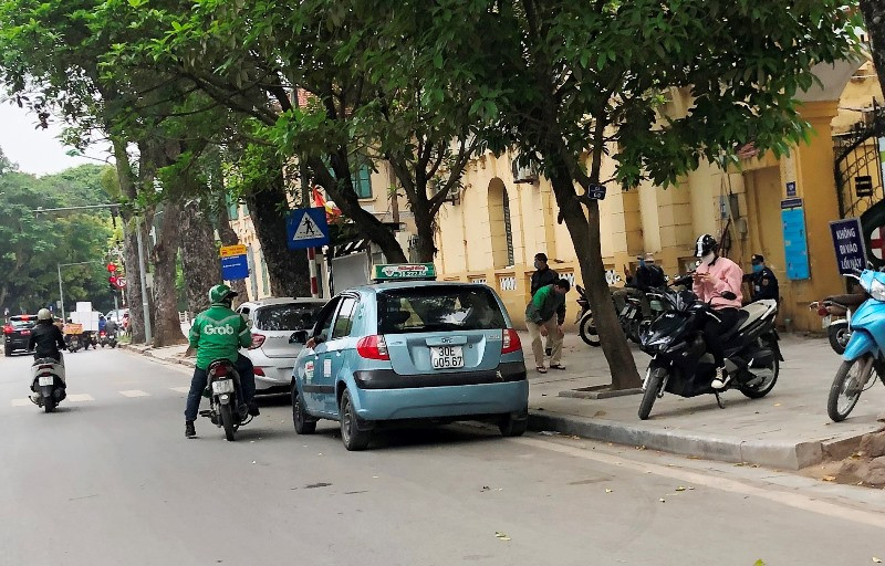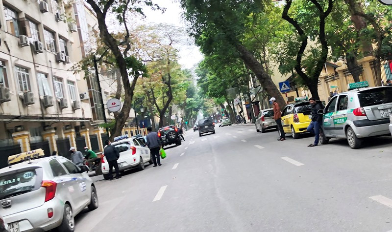 Trên đường Tràng Thi đoạn qua Bệnh viện Phụ Sản Trung ương, chúng tôi ghi nhận được nhiều taxi đỗ thành hàng dài bắt khách trên đường..
