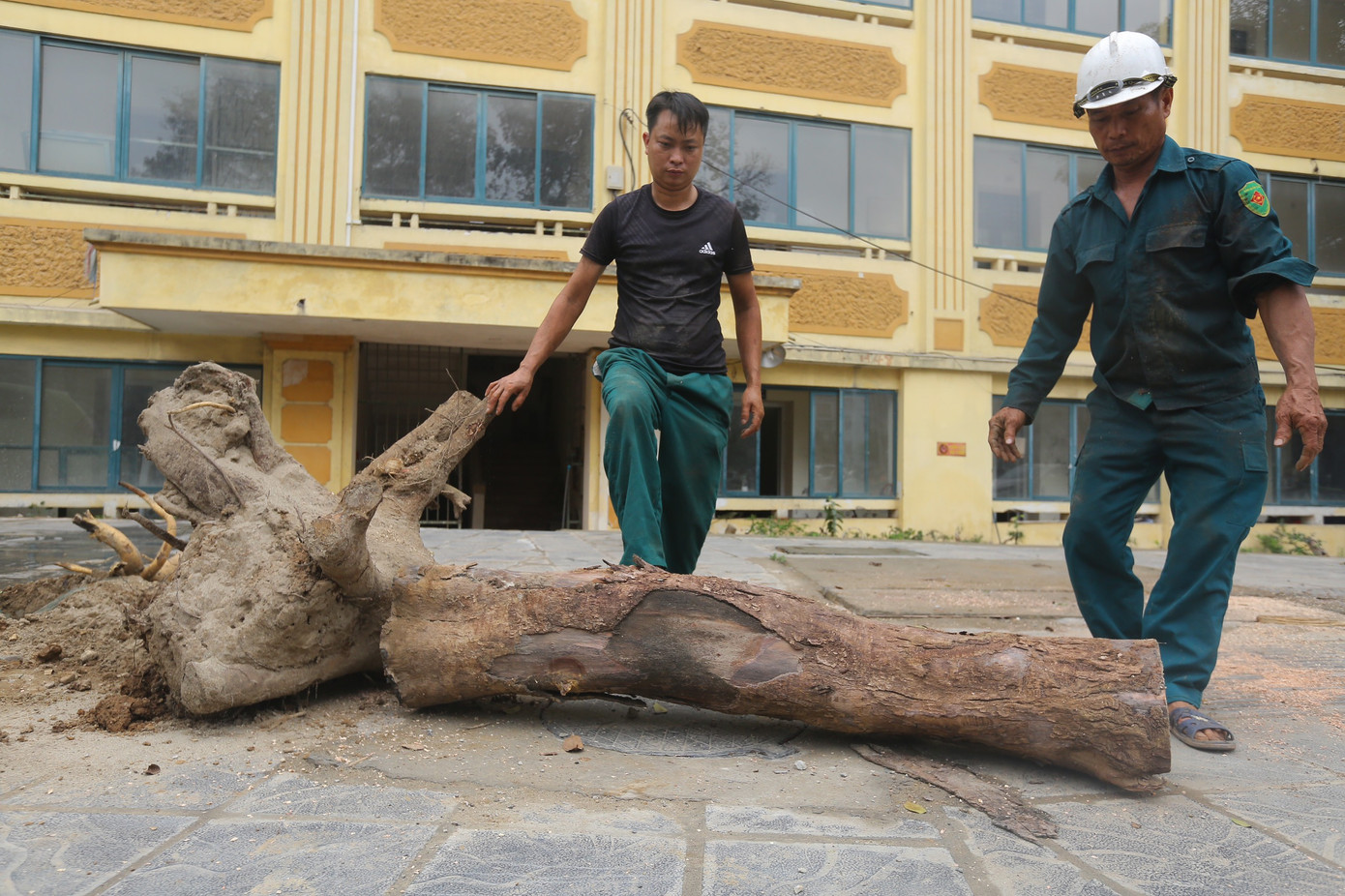| Các công nhân tiến hành dọn dẹp, xử lý cây xanh chết khô trên đường Huỳnh Thúc Kháng kéo dài. Ảnh: Duy Phạm. |