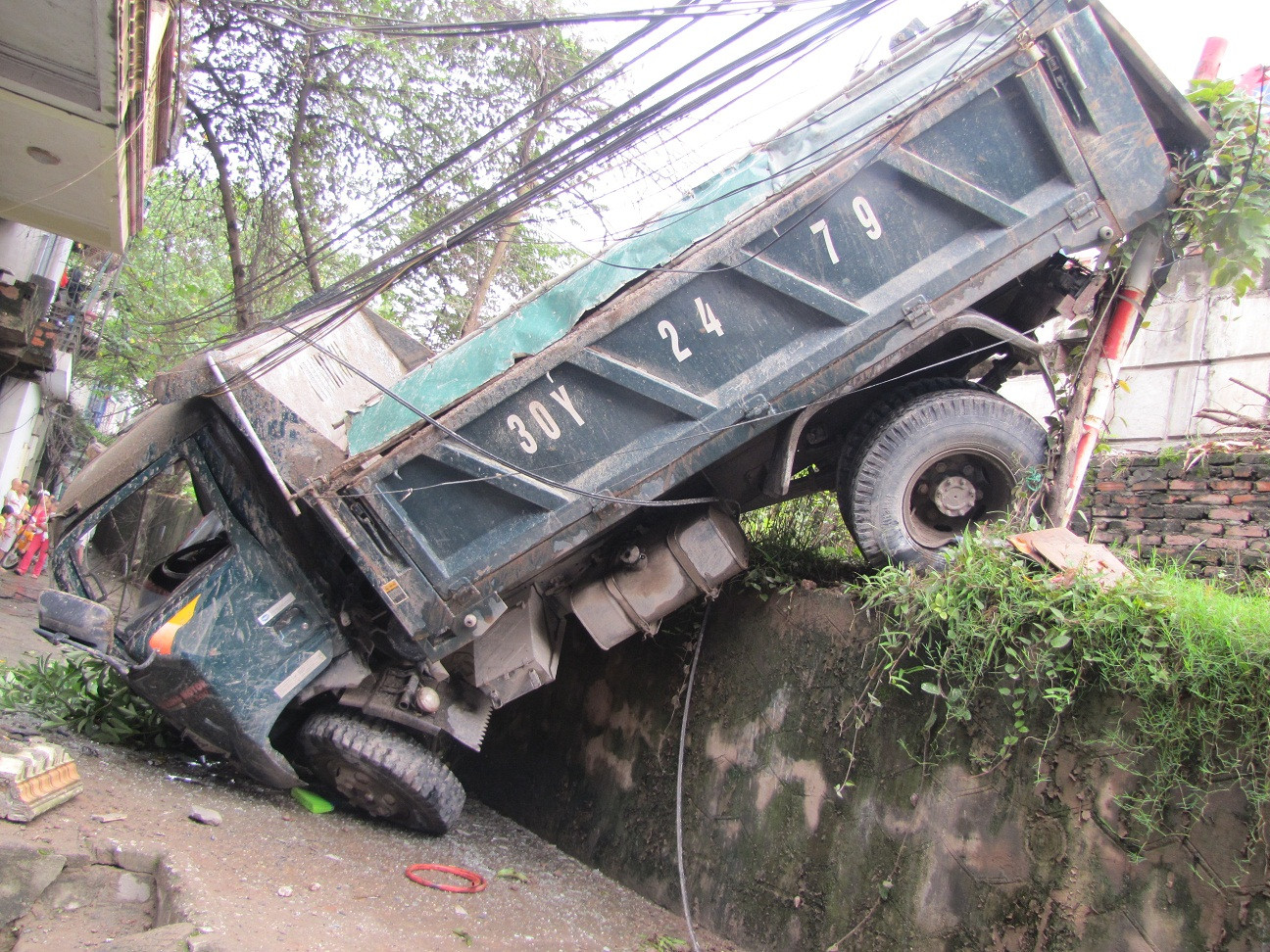 | Chiếc xe tải lao xuống chân đê Nguyễn Khoái. |