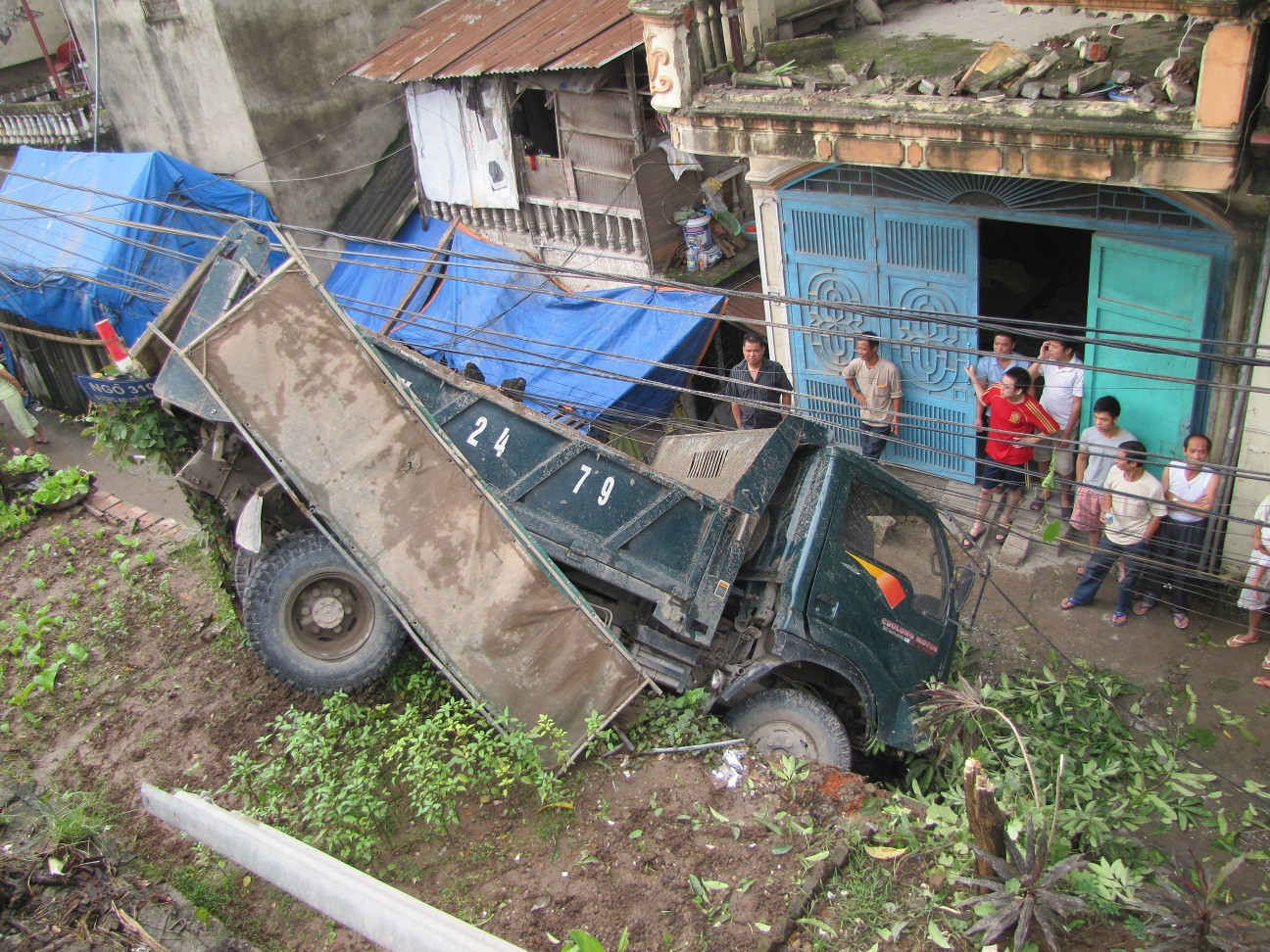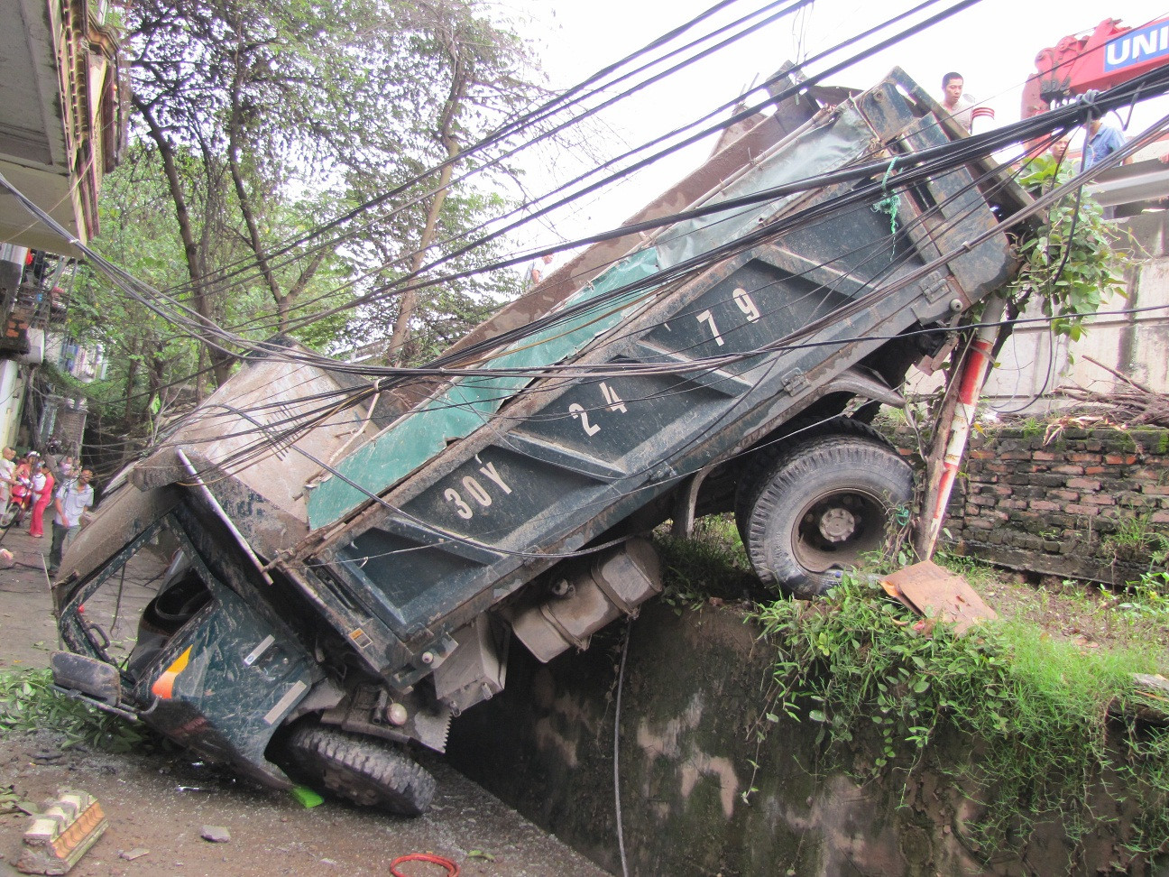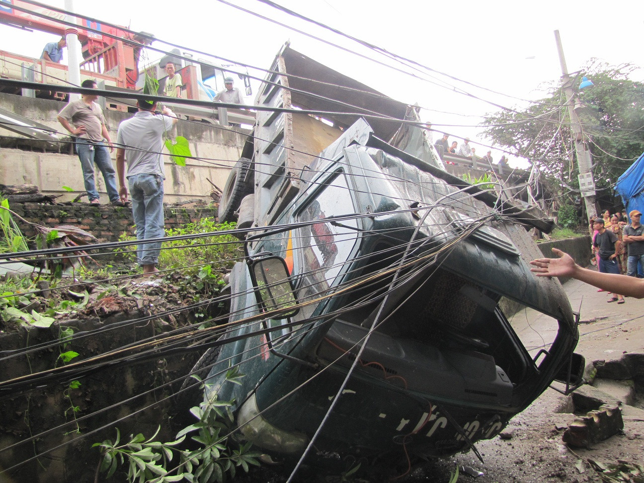 Tại hiện trường, chiếc xe tải lao xuống vực kéo theo rất nhiều dây điện, đầu xe chúi xuống đất bẹp dúm, trong khi phần đuôi xe vẫn chơi vơi trên một bức tường phía trước nhà dân. Khoảng cách từ đường đê Nguyễn Khoái xuống mặt đất nơi chiếc xe tải "hạ cánh" khoảng 5m.