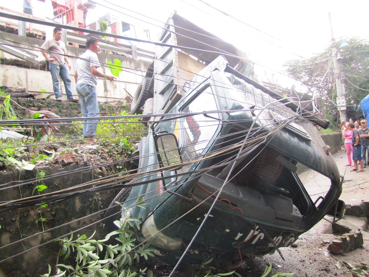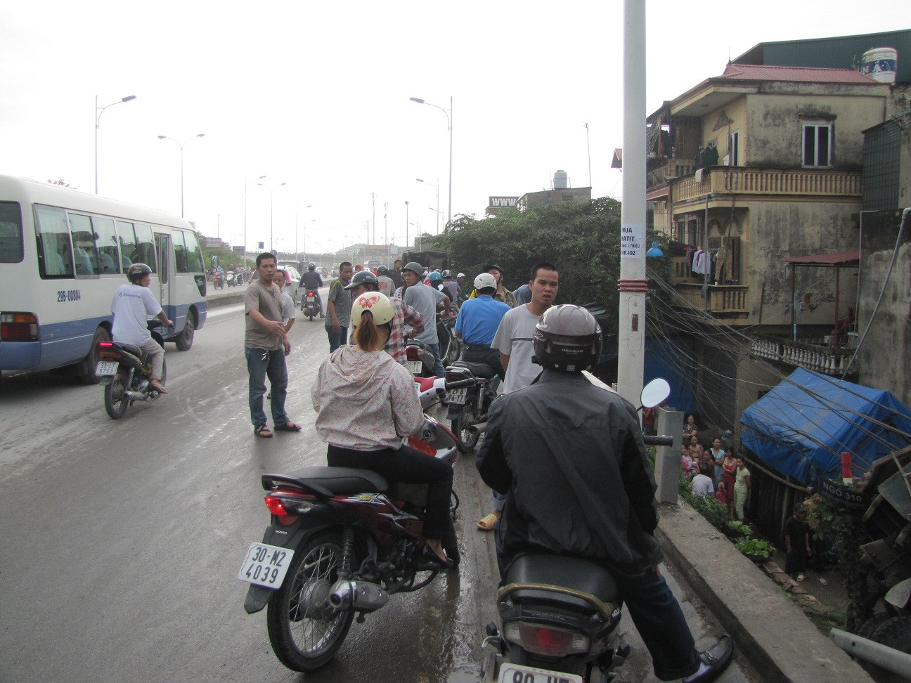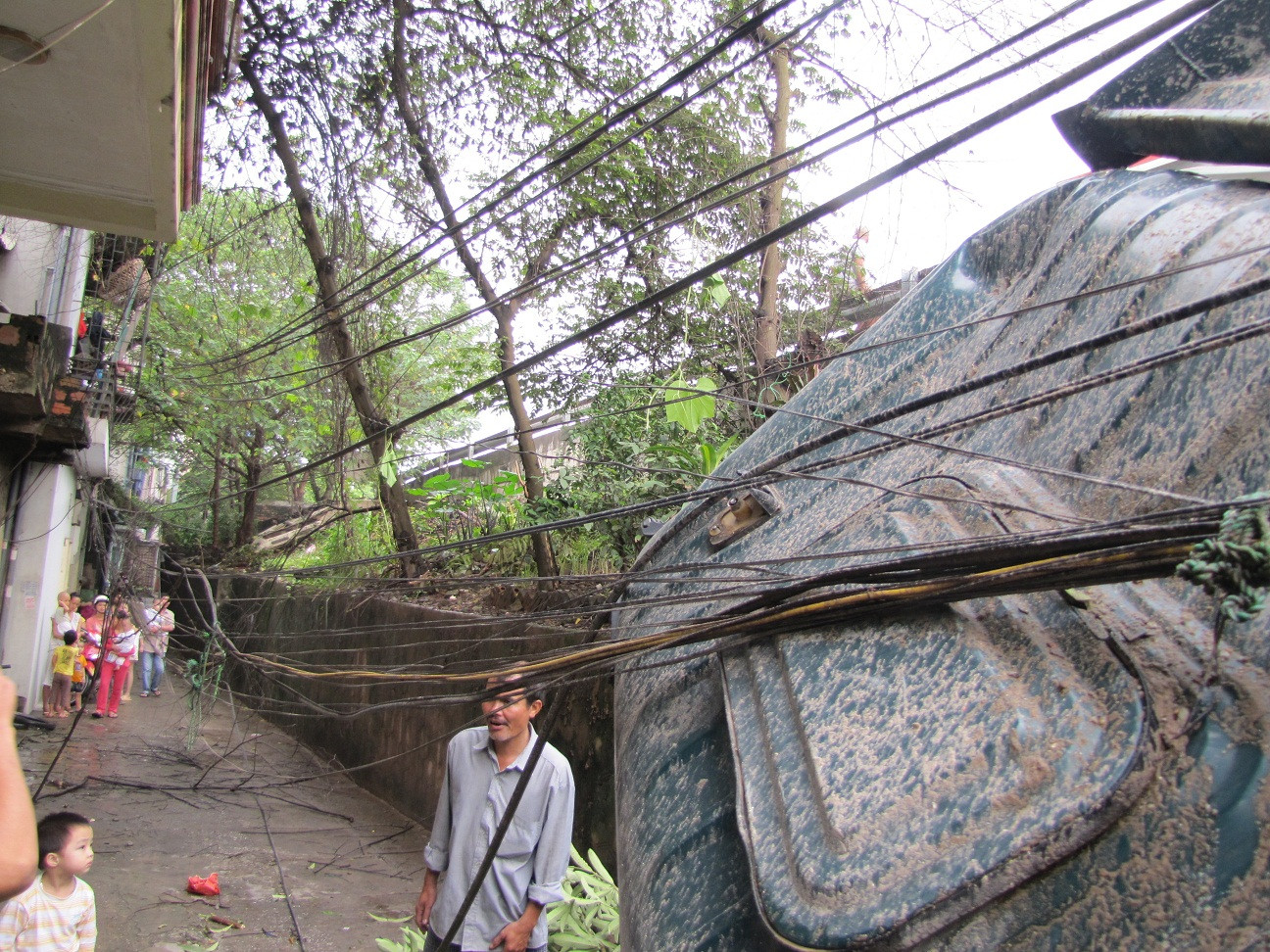 Tại hiện trường, chiếc xe tải lao xuống vực kéo theo rất nhiều dây điện, đầu xe chúi xuống đất bẹp dúm, trong khi phần đuôi xe vẫn chơi vơi trên một bức tường phía trước nhà dân. Khoảng cách từ đường đê Nguyễn Khoái xuống mặt đất nơi chiếc xe tải "hạ cánh" khoảng 5m.