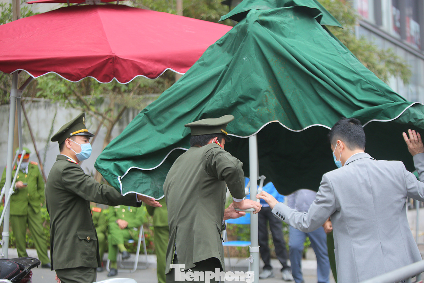 Lực lượng chức năng căng ô, lều dã chiến ngay trong sảnh chung cư sẵn sàng cho tình huống phong toả toà nhà nhiều ngày để phòng, chống dịch COVID-19.