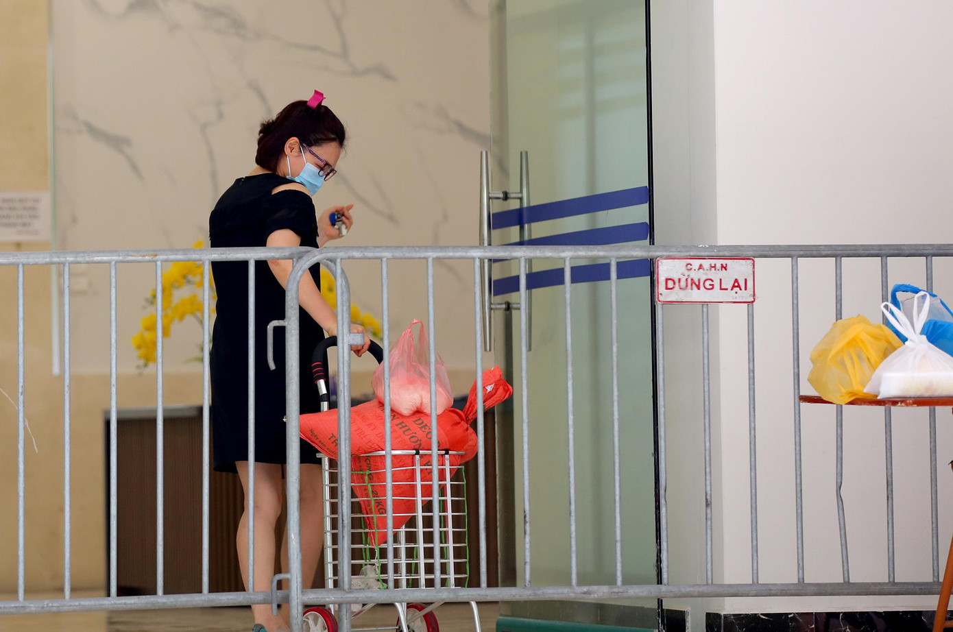Cư dân trong toà nhà chờ người thân chuyển đồ tiếp tế.