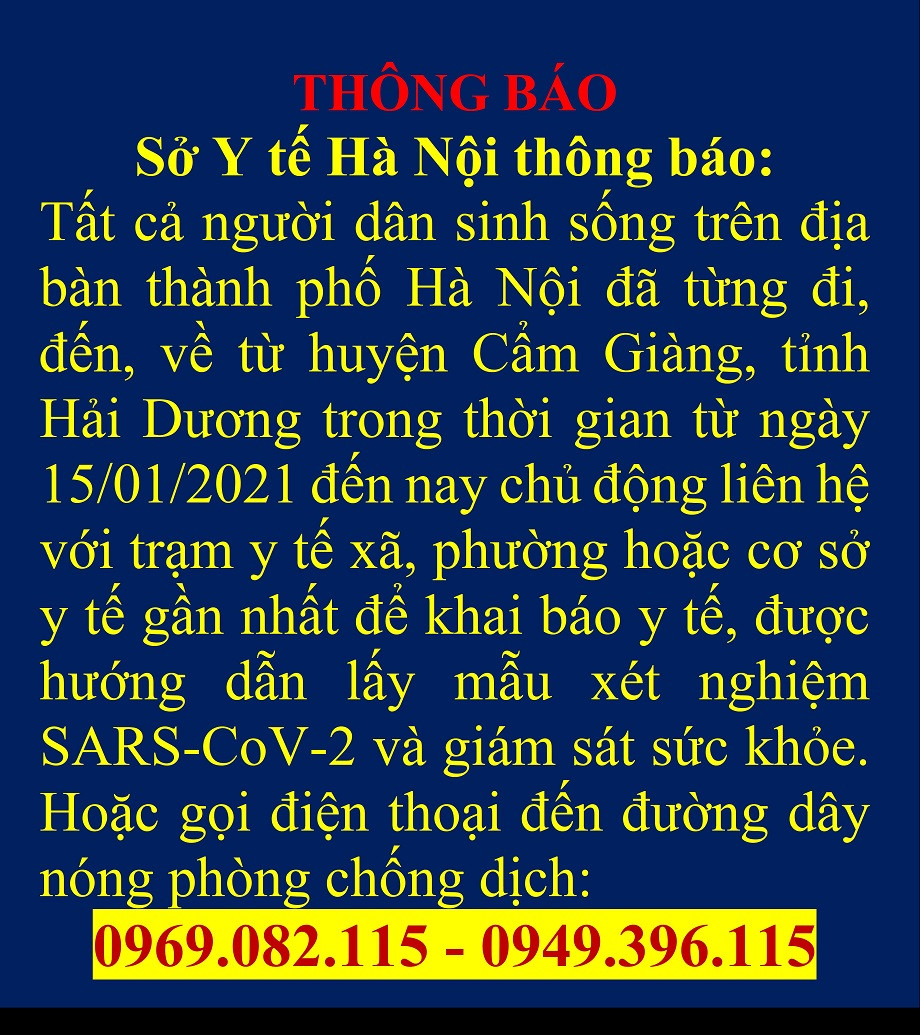 Cụ thể, Sở Y tế Hà Nội yêu cầu, tất cả người dân sinh sống trên địa bàn thành phố Hà Nội đã từng đi, đến, về từ huyện Cẩm Giàng (tỉnh Hải Dương) trong thời gian từ 15/1/2021 đến nay chủ động liên hệ với trạm y tế xã, phường hoặc cơ sở y tế gần nhất để khai báo y tế, được hướng dẫn lấy mẫu xét nghiệm SARS-CoV-2 và giám sát sức khỏe, hoặc gọi điện thoại đến đường dây nóng phòng chống dịch 0969 082 115 – 0949 396 115.
