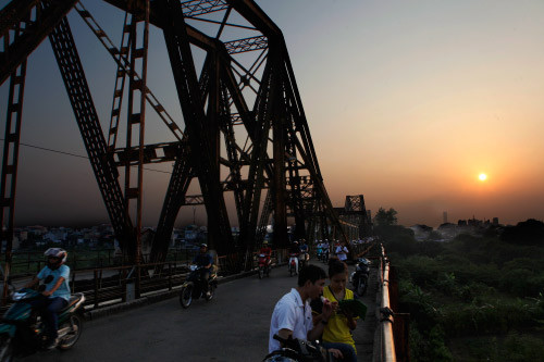 Mỗi buổi chiều, nhiều người lại phóng xe lên cầu Long Biên ngắm mặt trời lặn...