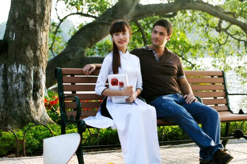 Thiếu nữ Việt trong tà áo dài trắng tinh khiết dưới mùa thu Hà Nội khiến du khách nước ngoài ngẩn ngơ, ké chụp chung một tấm hình làm kỉ niệm.