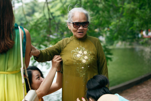 Ba cháu gái diện áo dài cho bà đi dạo chơi, chụp ảnh để bà nhớ về buổi sáng mùa thu 60 năm về trước tại Hồ Gươm