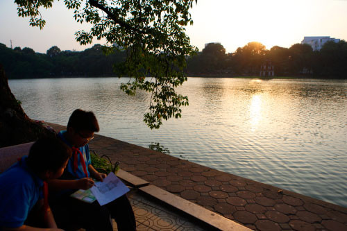 Hà Nội có nhiều cảnh đẹp nhưng có lẽ Hồ Gươm vẫn là điểm đến thú vị nhất. Trong ảnh một bạn sinh viên ĐH Kiến trúc (Hà Nội) đang vẽ tháp Báo Ân.