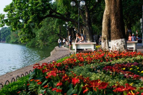 Hay thong dong dạo quanh Hồ Gươm, trầm mặc cổ kính. Không chỉ chụp lại những bức hình đẹp trong tiết trời thu mà còn được gặp, giao lưu với rất nhiều du khách nước ngoài.