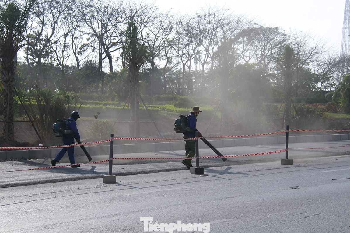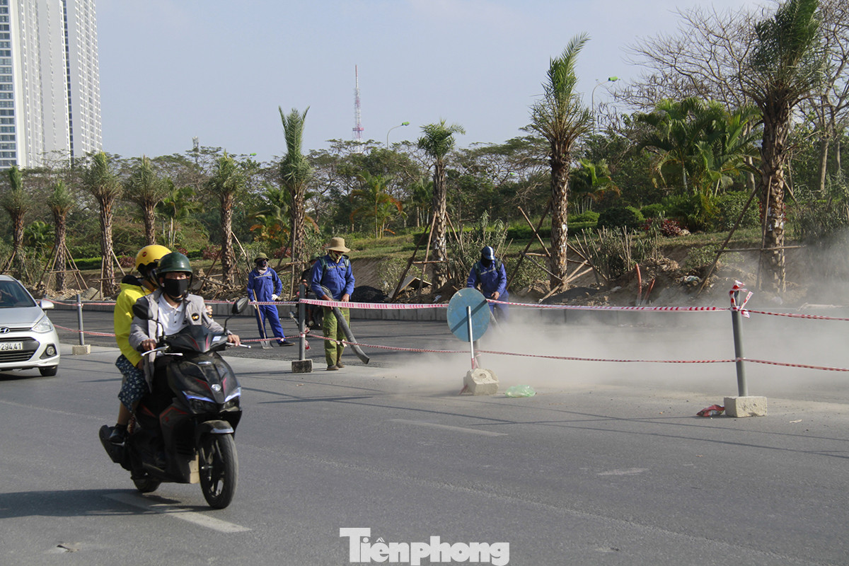 Chiều 16/12, theo ghi nhận của phóng viên Tiền Phong, công trường mở rộng đường ở Đại lộ Thăng Long dùng máy công suất lớn thổi bụi để làm sạch mặt bằng, gây bụi mù mịt