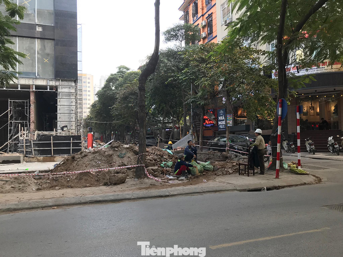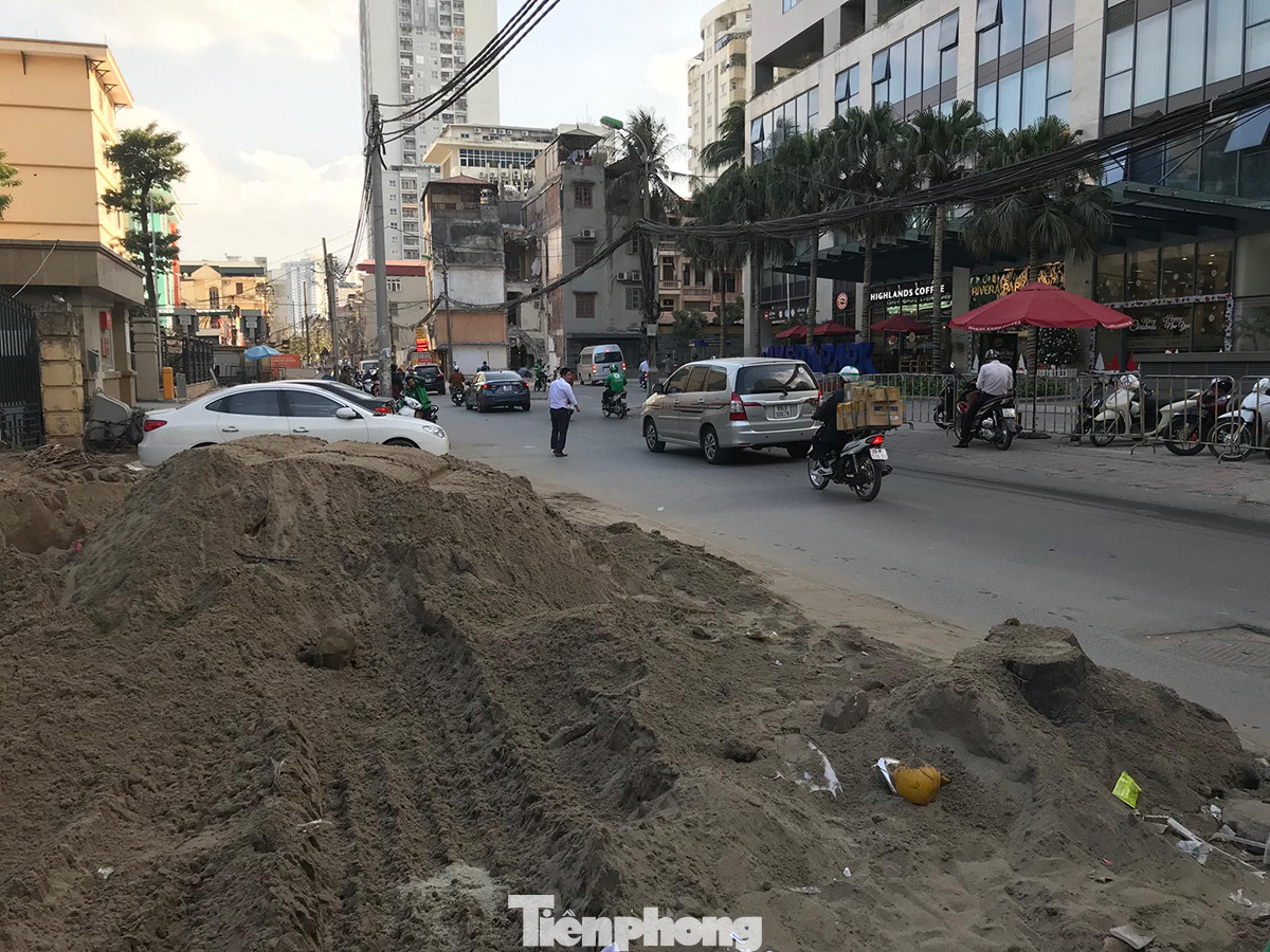 Tuyến phố Trần Xuân Soạn, Thi Sách, Ngô Thì Nhậm trên địa bàn quận Hai Bà Trưng được lật lên để lát đá với cát, sỏi tập kết không che chắn gây ra "mưa bụi"
