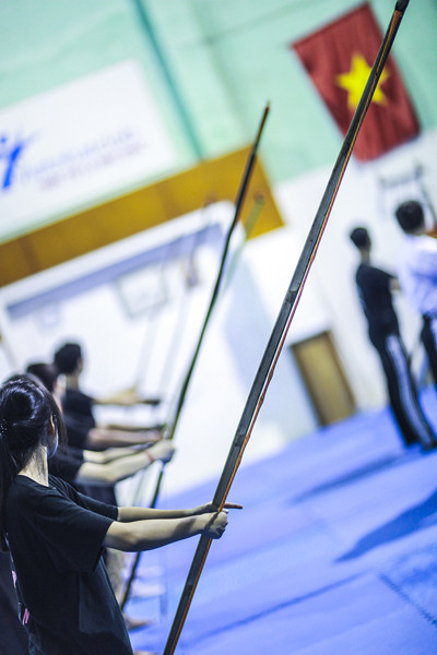 Để làm quen, trước tiên các bạn trẻ được học cách sử dụng cung mô hình. Khi luyện tập, tư thế rất quan trọng, vì thế các thao tác đứng, ngồi, giương cung... chiếm nhiều thời lượng học.