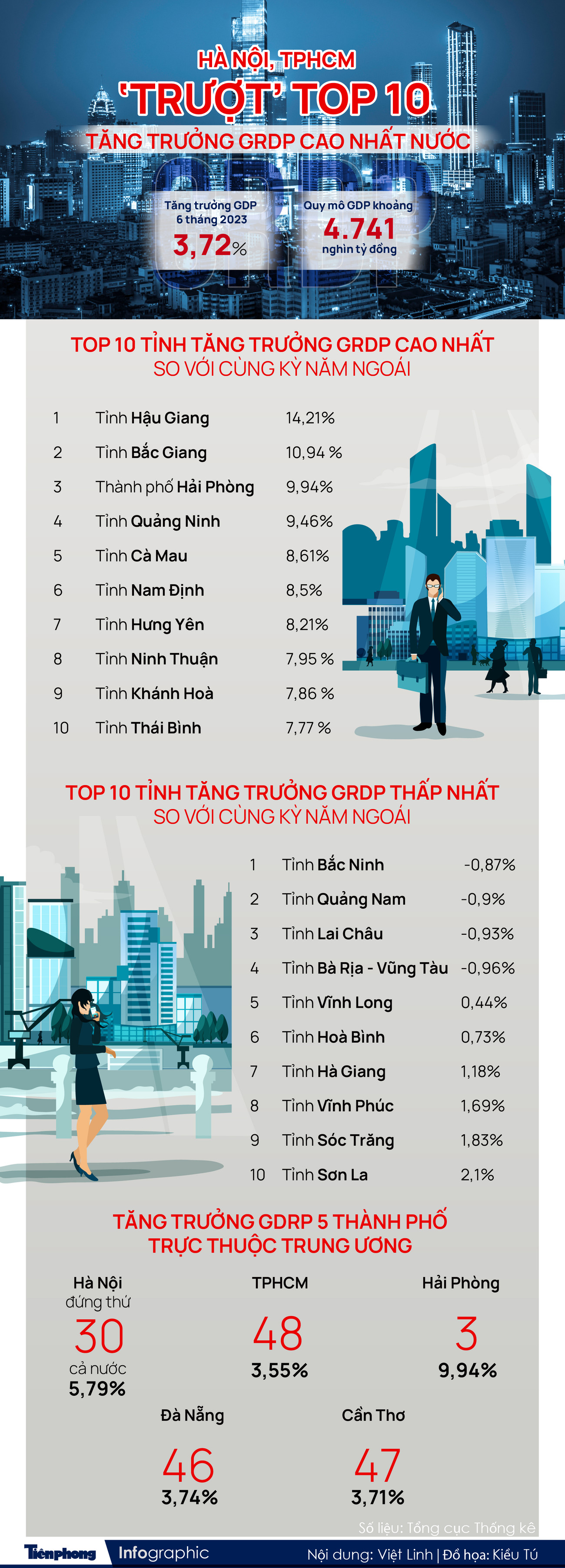 TPO - Trong 10 địa phương tốc độ tăng trưởng tổng sản phẩm trên địa bàn (GRDP) cao nhất cả nước, chỉ Hải Phòng là đại diện duy nhất của nhóm 5 thành phố trực thuộc trung ương. Hà Nội ở top giữa, còn TPHCM, Cần Thơ, Đà Nẵng ở nửa cuối.