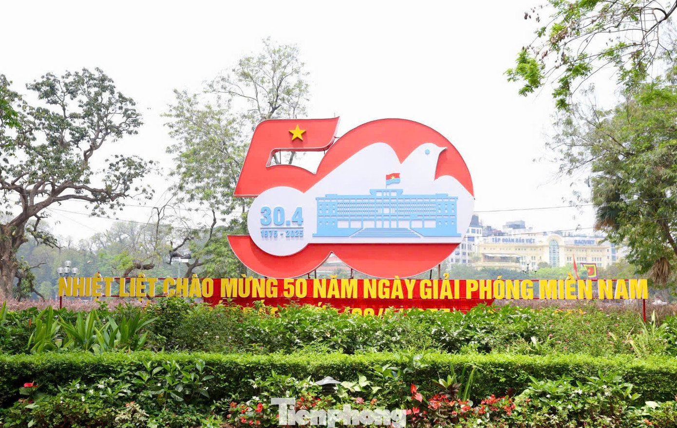 | Quanh hồ Hoàn Kiếm hiện đã bố trí hàng loạt biểu tượng "50 năm Ngày Giải phóng miền Nam, Thống nhất đất nước". |